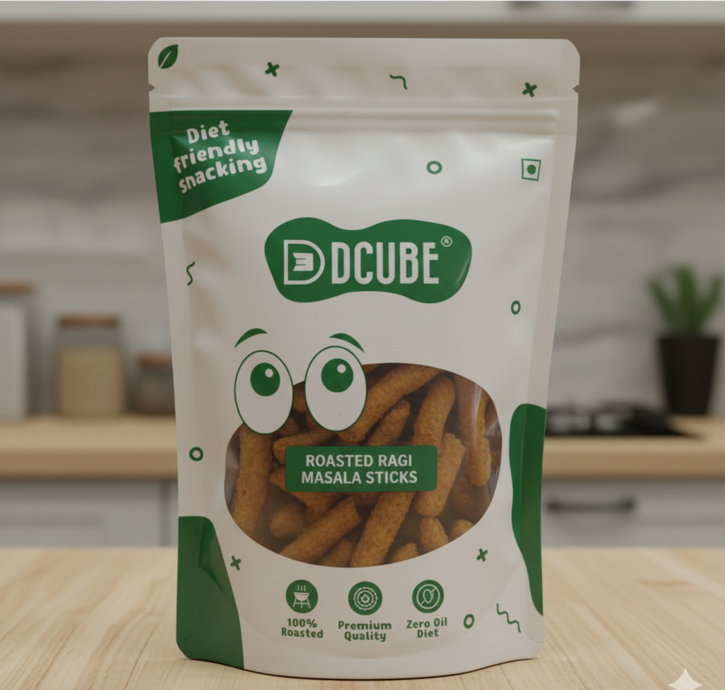 DCUBE Roasted Ragi Masala Sticks are a crunchy, flavorful, and nutritious snack made from 100% roasted ragi (finger millet) flour blended with a bold, aromatic masala seasoning. Rich in dietary fiber, plant-based protein, calcium, and iron, these sticks support digestive health, bone strength, and sustained energy release.